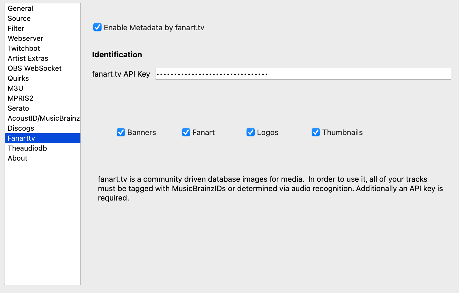 fanart.tv is a community project to provide high quality artwork for music and other media. It requires music be tagged with MusicBrainz artist ids. You will need a Fanart API Key in order to use this service.