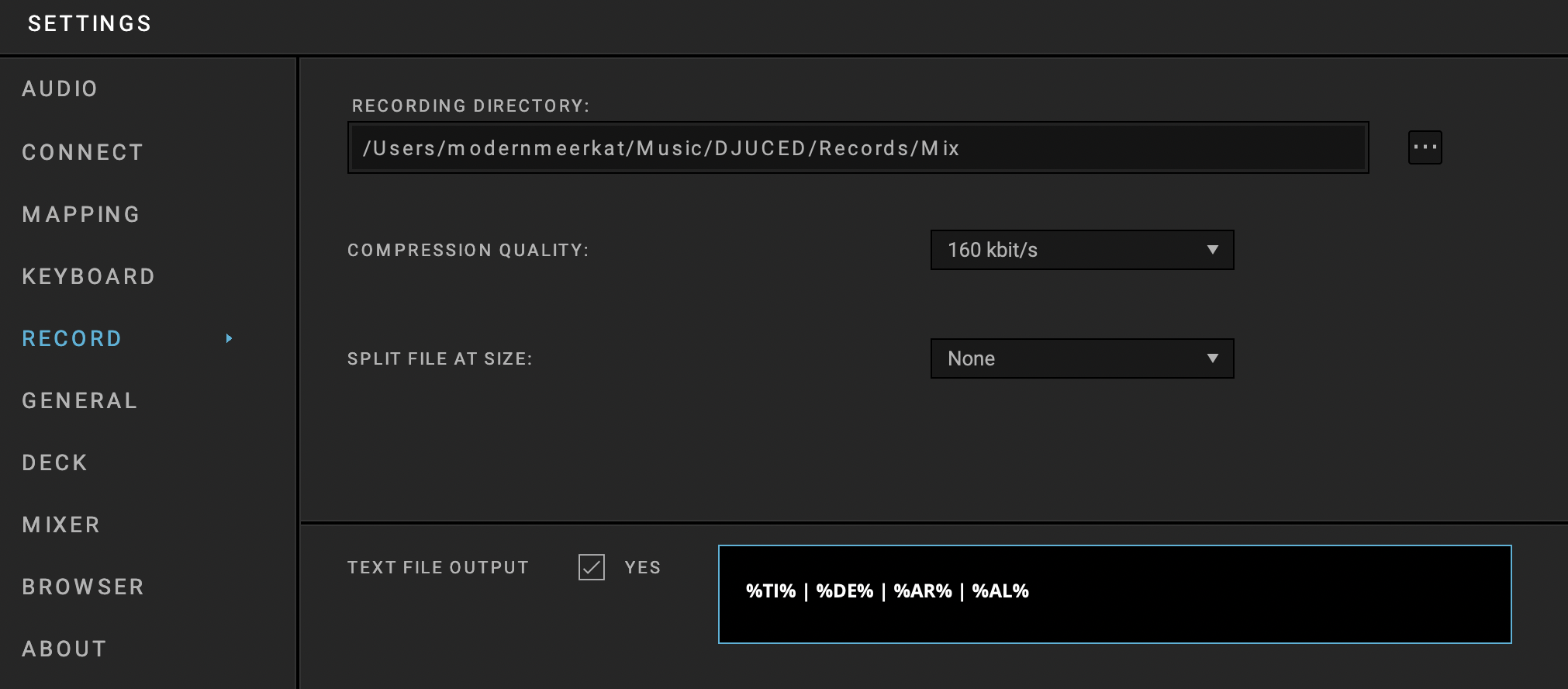 - In DJUCED, go into Settings -> Record. Turn on Text File Output.