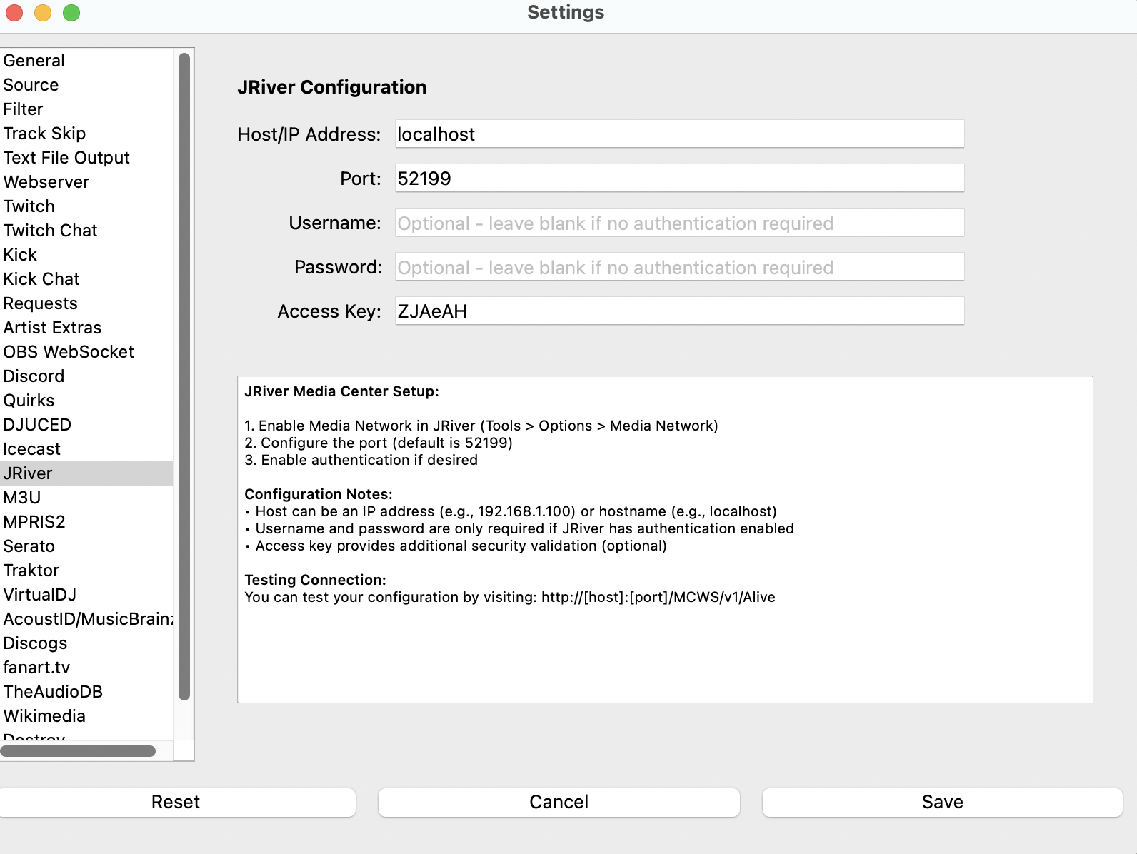 Access Key (Optional) Access key for additional security validation if configured in JRiver