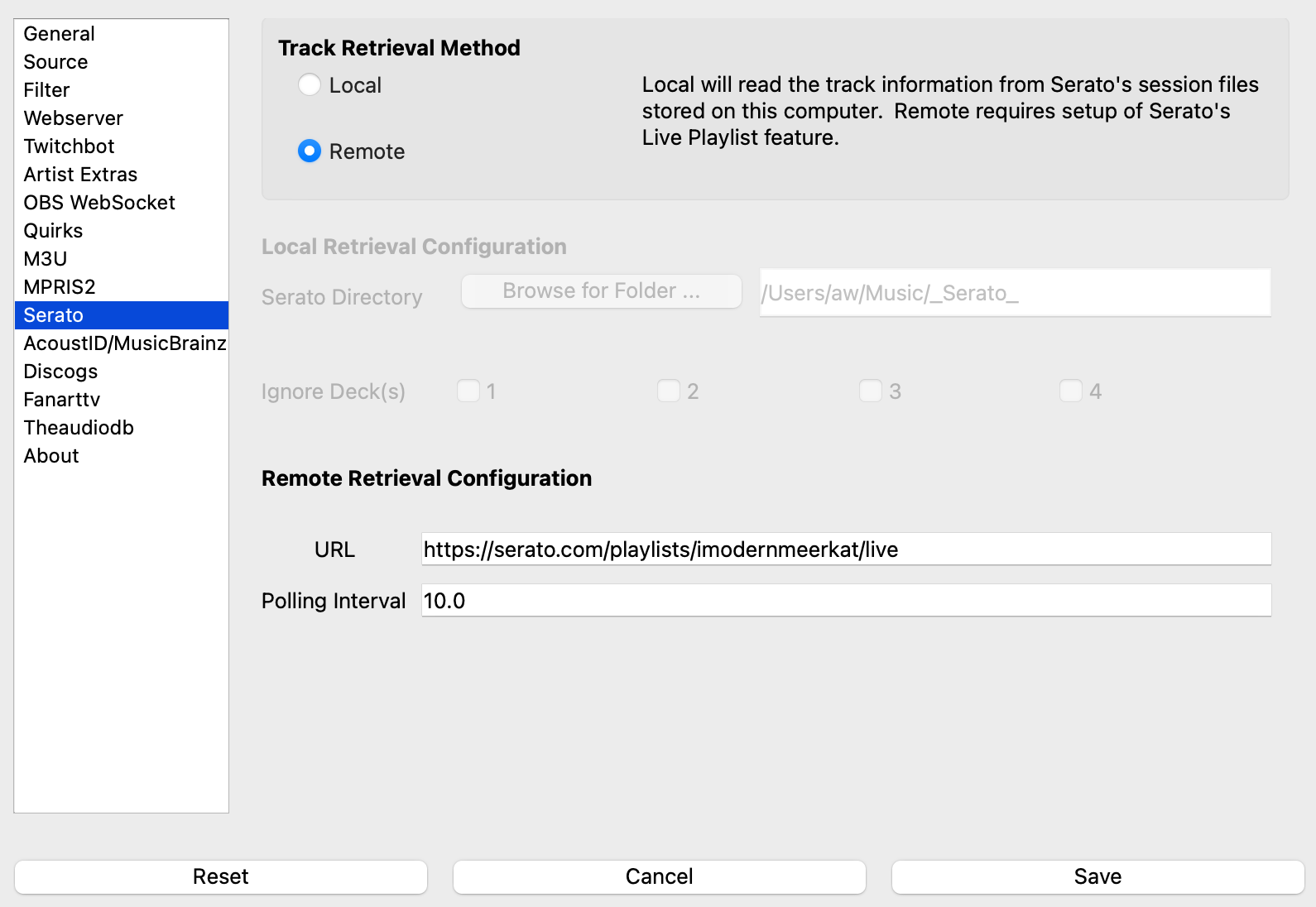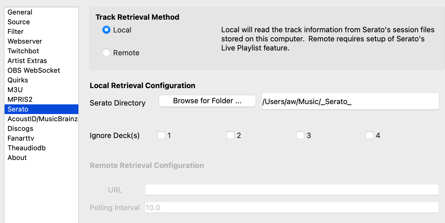 In Remote mode, What's Now Playing will read Serato Live Playlists over the Internet. This mode allows for What's Now Playing to run on a different computer than the DJ computer, but does not have as much data available.