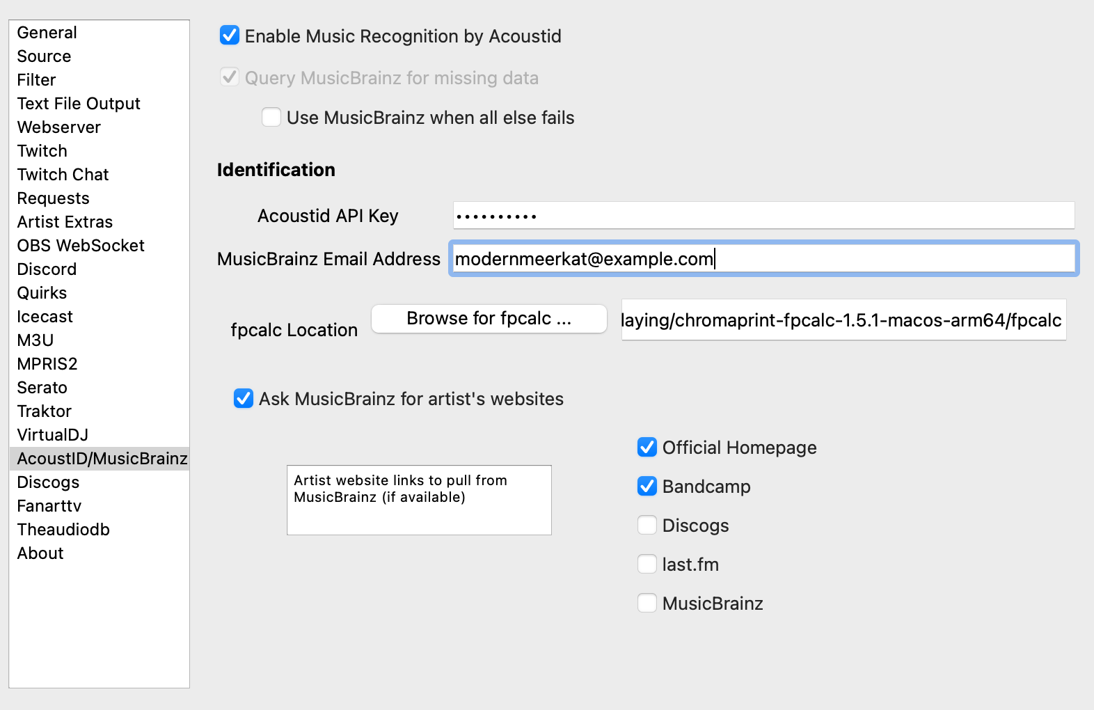 MusicBrainz Email Address - If you would like the data fetched to include artist website data,