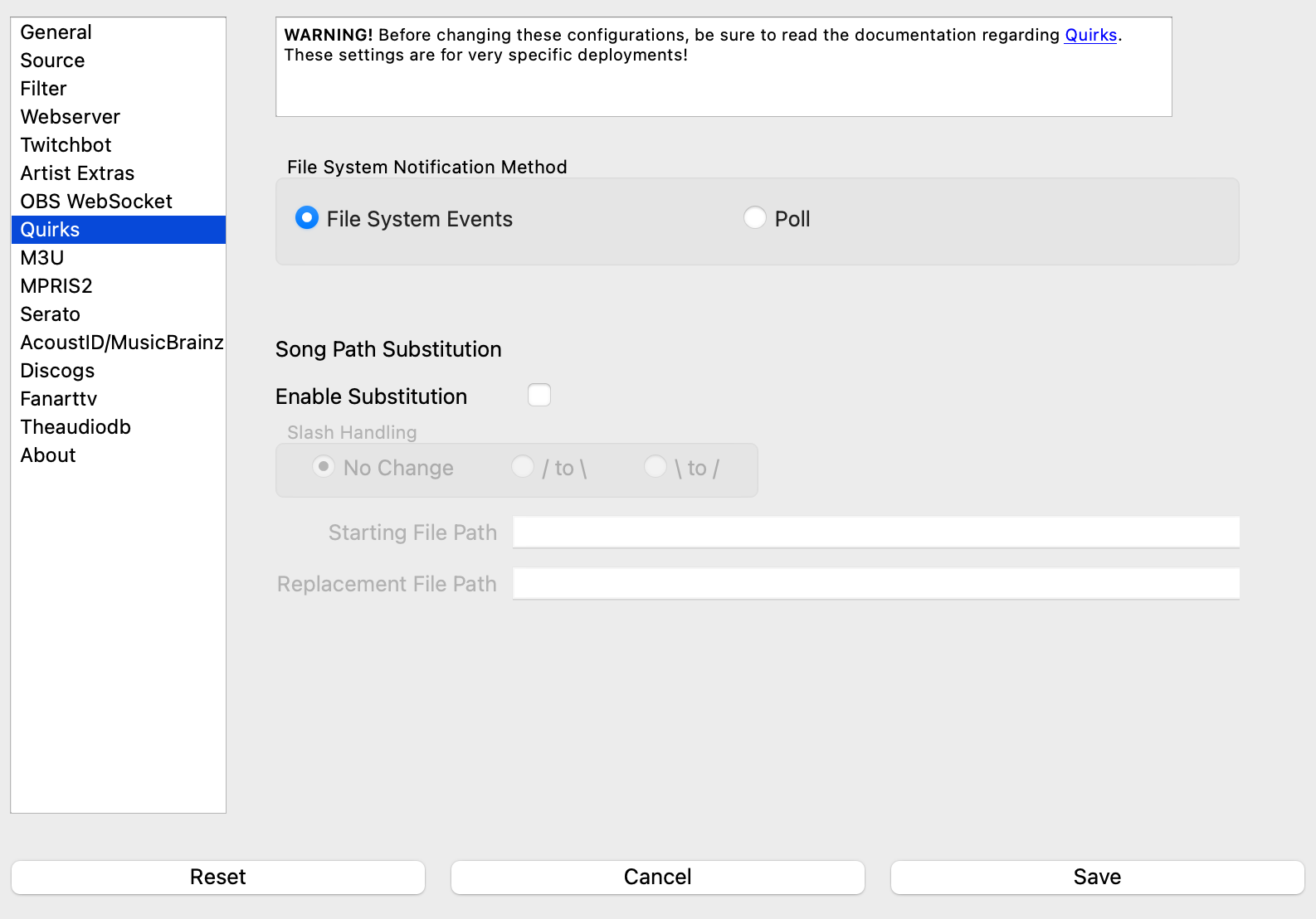 Like the previous issue, the DJ software's files may reference a file path unlike what What's Now Playing has access to on the machine where it is running. Setting these values will allow you to do a 'search and replace' of any referenced song files.