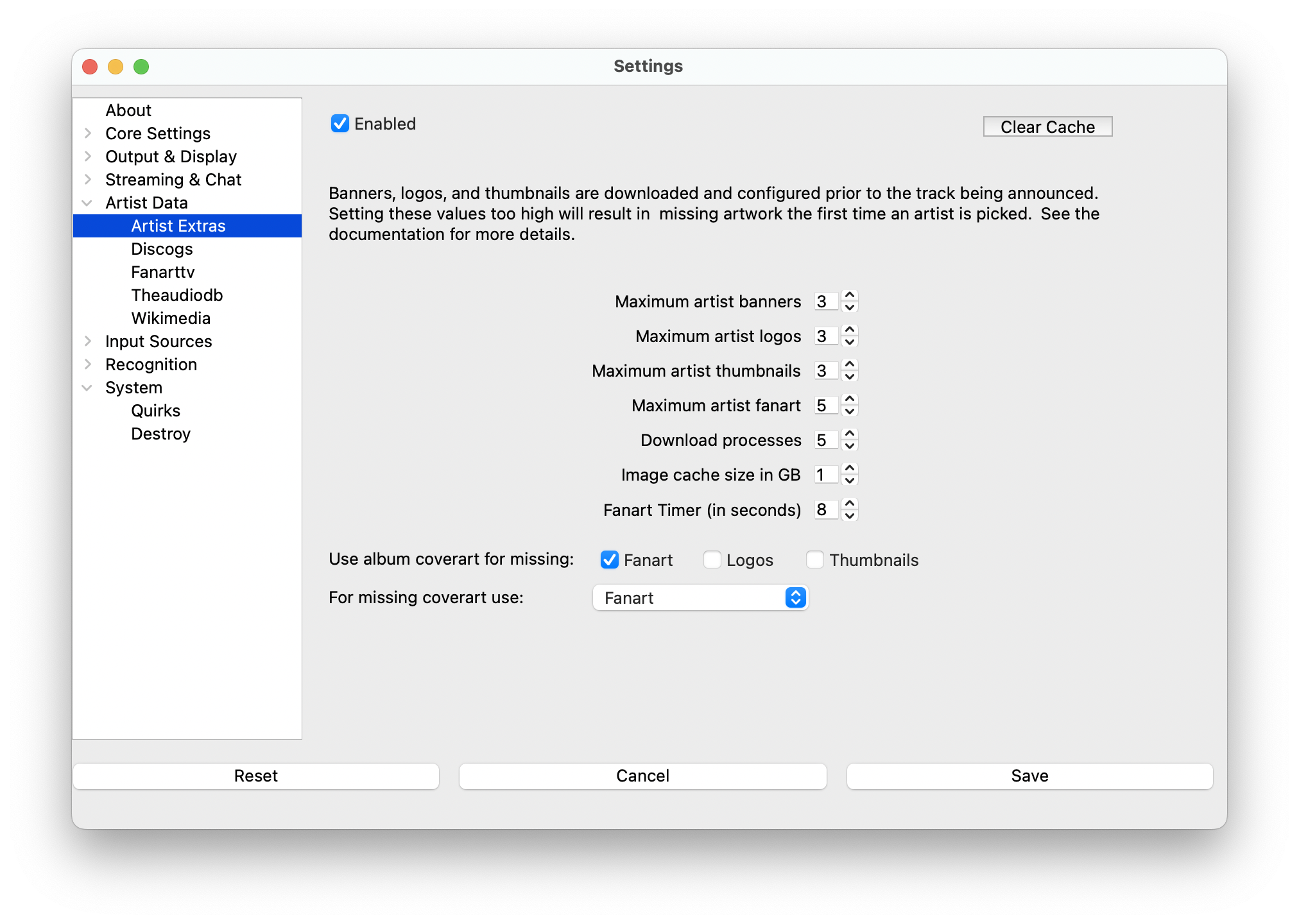 Clear Cache button: Removes artist-to-image mappings but preserves API response cache