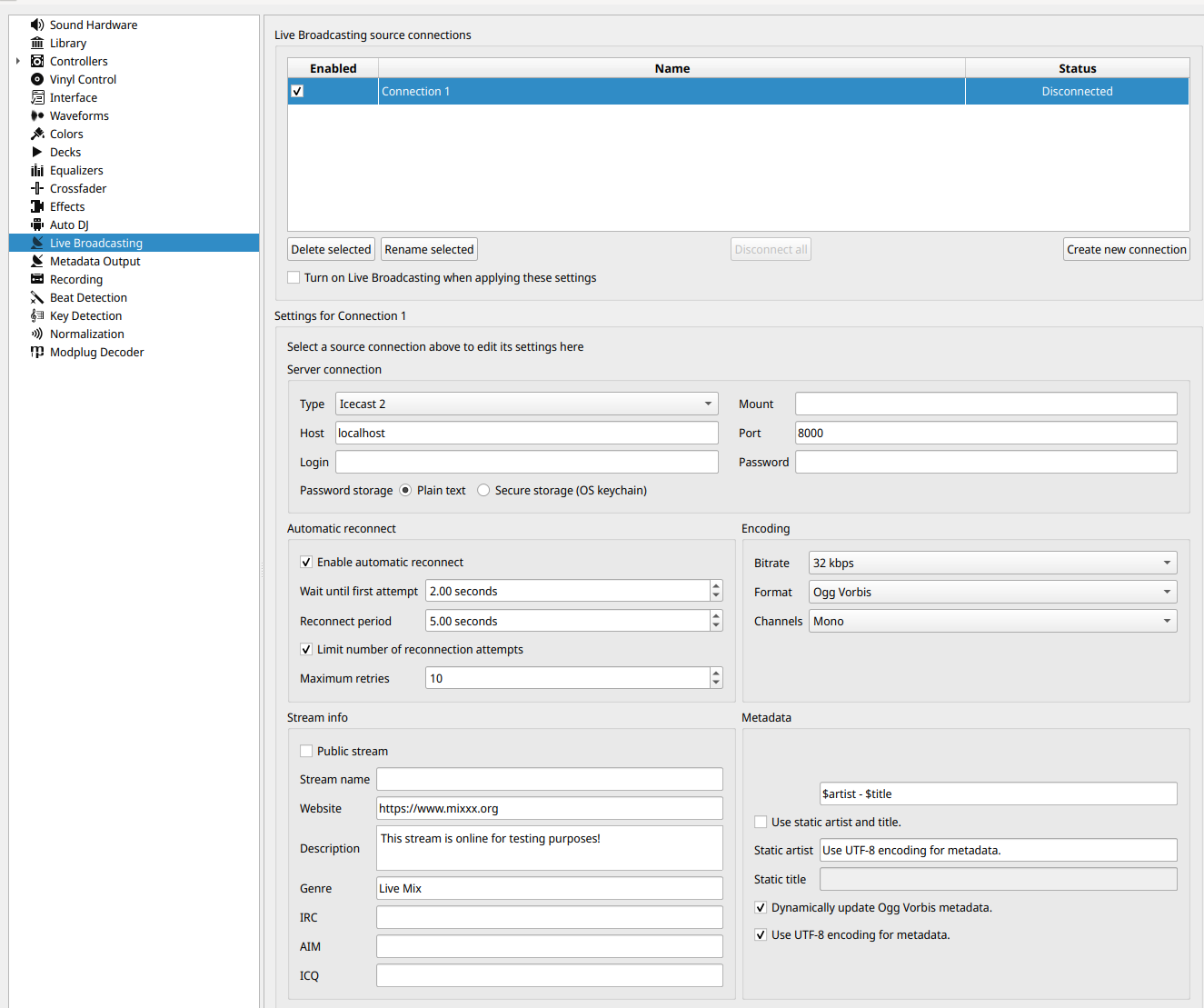 - Back on the main MIXXX screen, activate Icecast broadcasting: