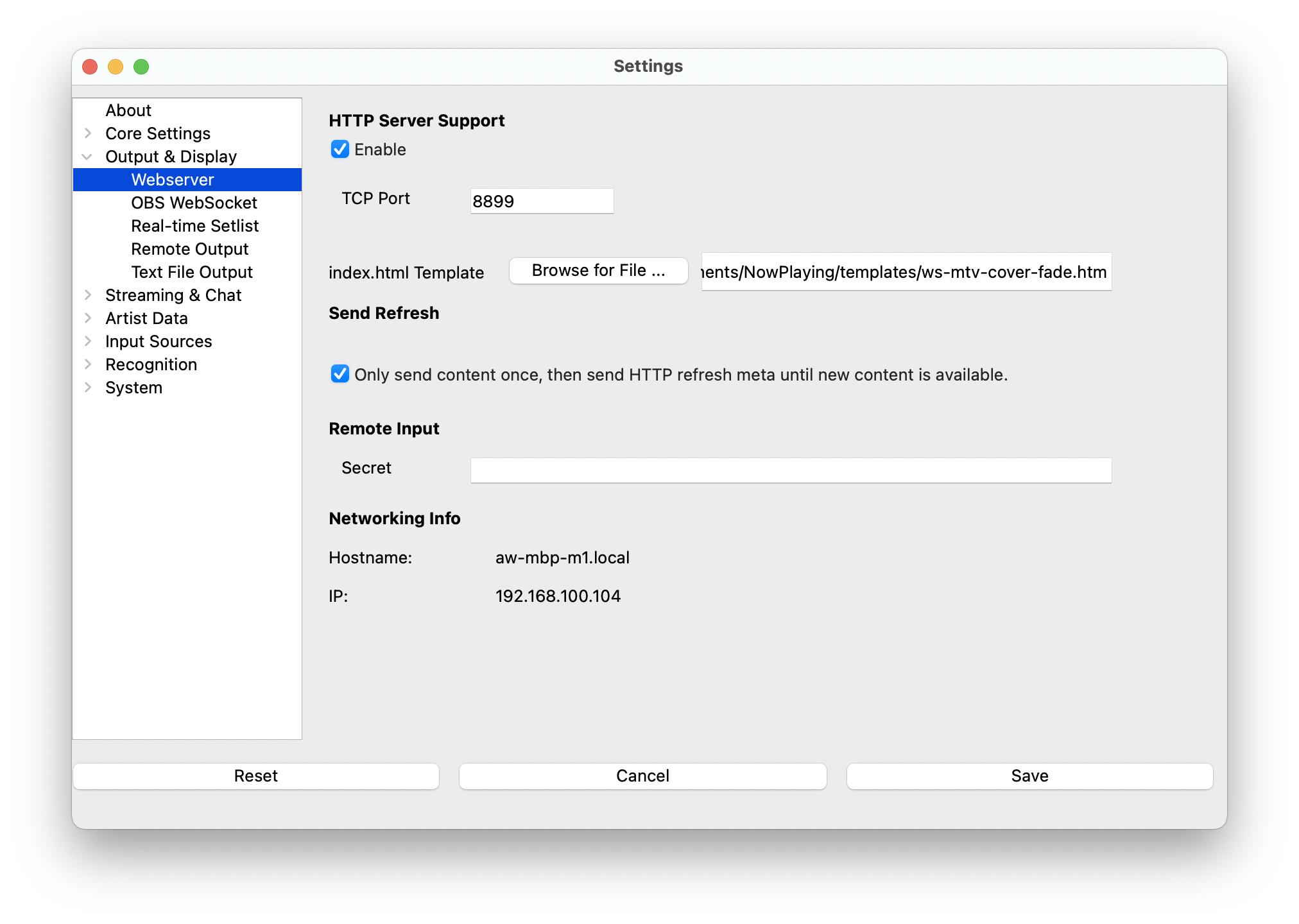 The webserver automatically advertises itself on the local network using Bonjour/Zeroconf, making it discoverable by other What's Now Playing instances and compatible applications on the same subnet. This feature is built into macOS, Windows 10+, and most Linux distributions.