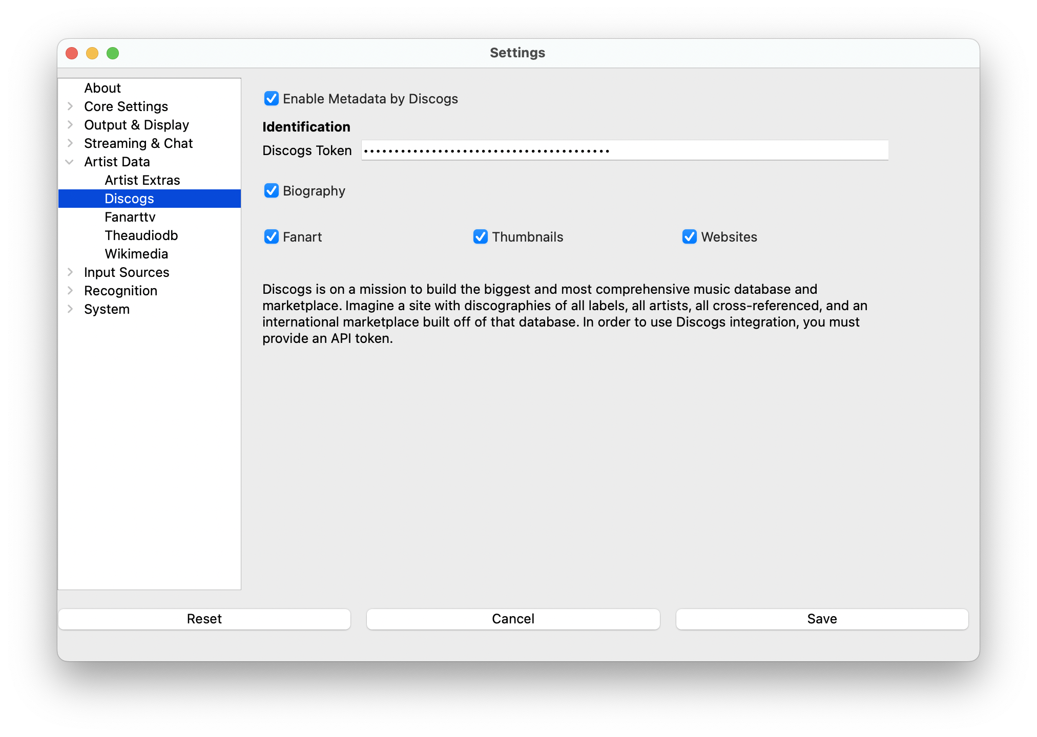 Note: Discogs settings are under Artist Data in the Settings menu.