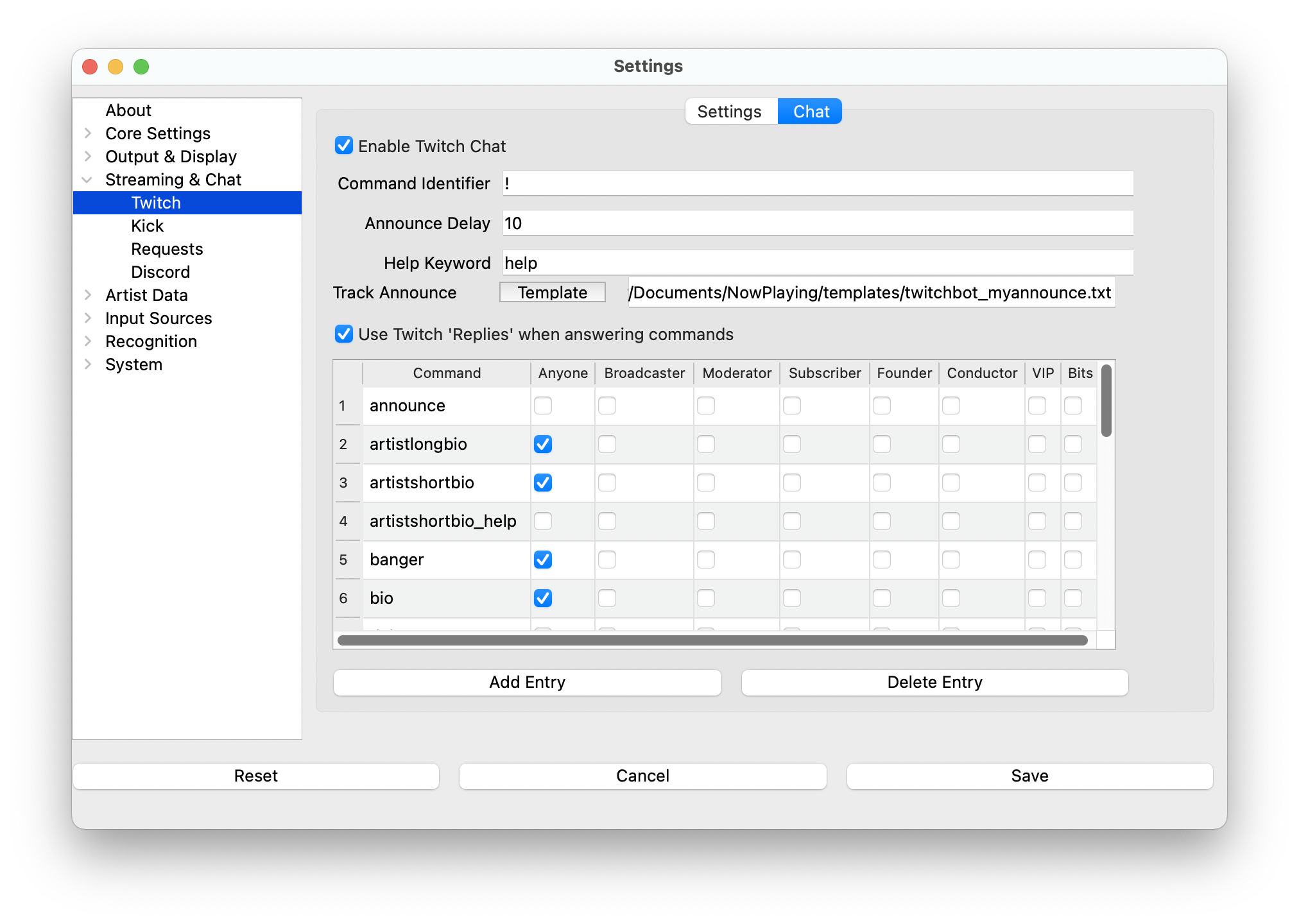 commands such as !track, !artist, and any custom commands you create.