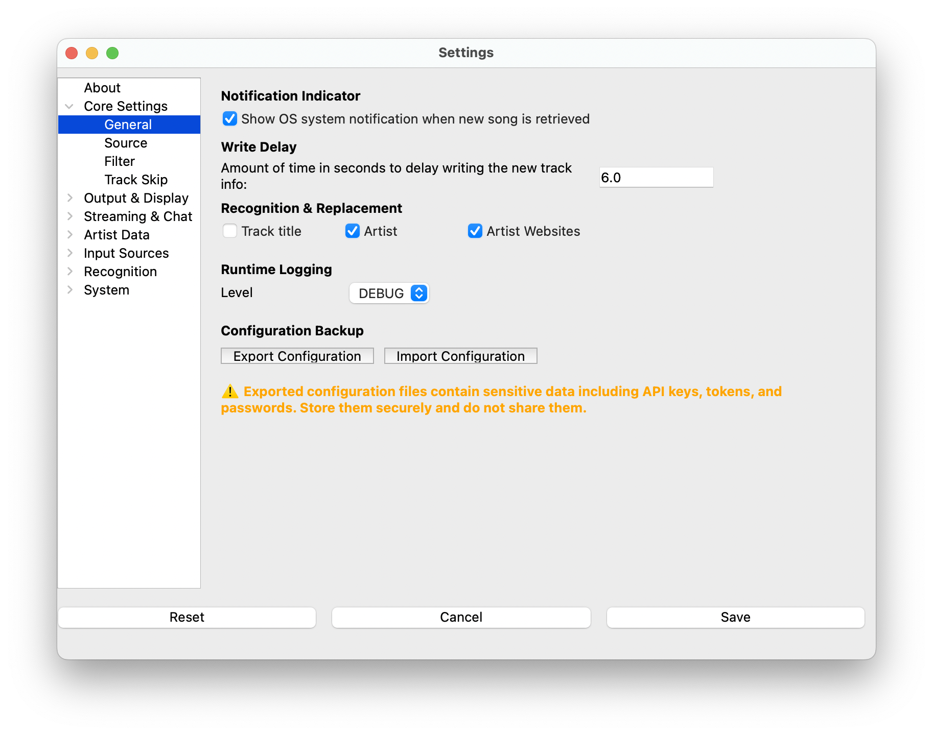 Export Configuration - Saves all your settings to a JSON file. This includes API keys, passwords, file paths, and all plugin configurations. ⚠️ Security Warning: The exported file contains sensitive data including API keys and passwords. Store it securely and do not share it.