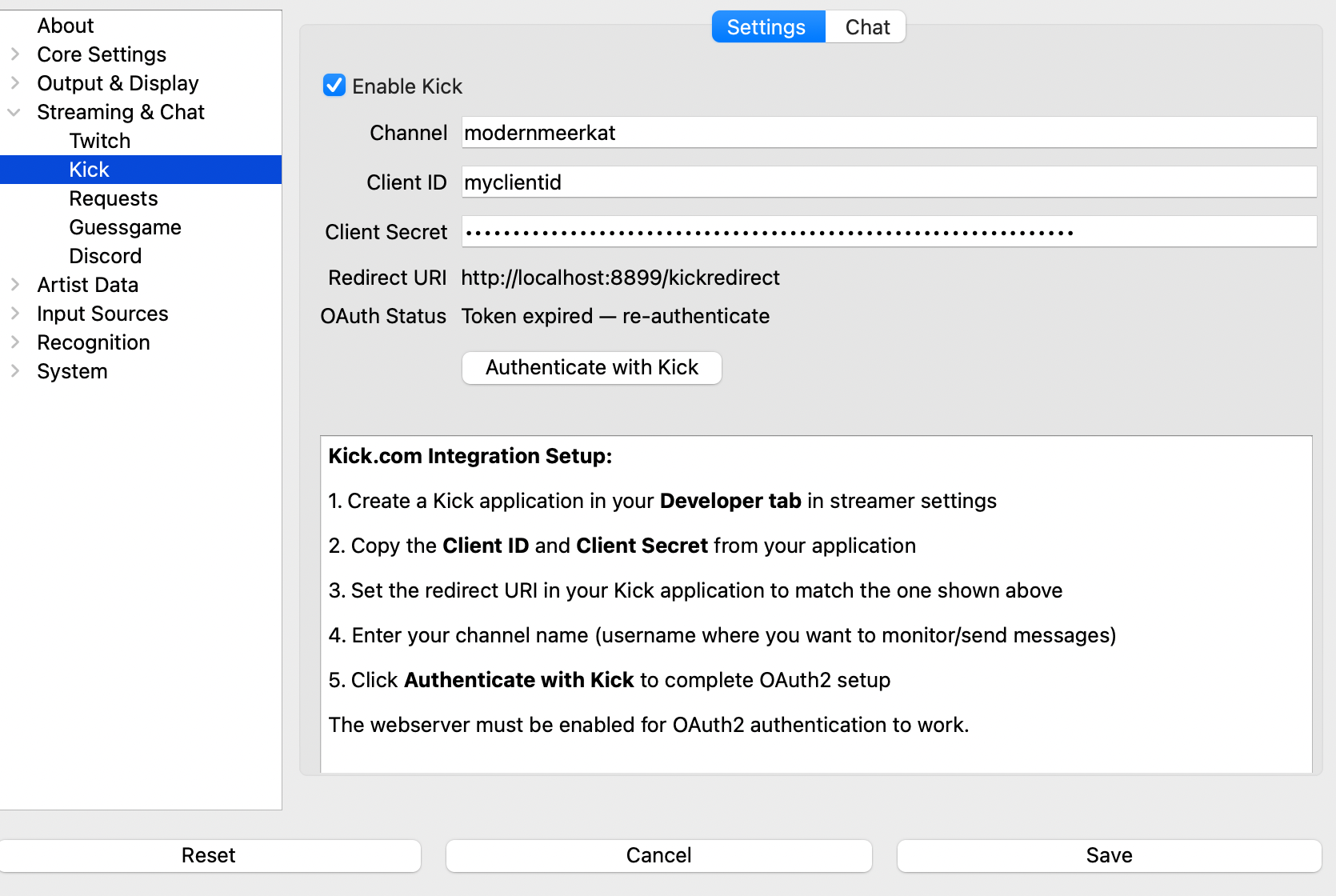 - Click "Authenticate with Kick" to complete OAuth2 setup